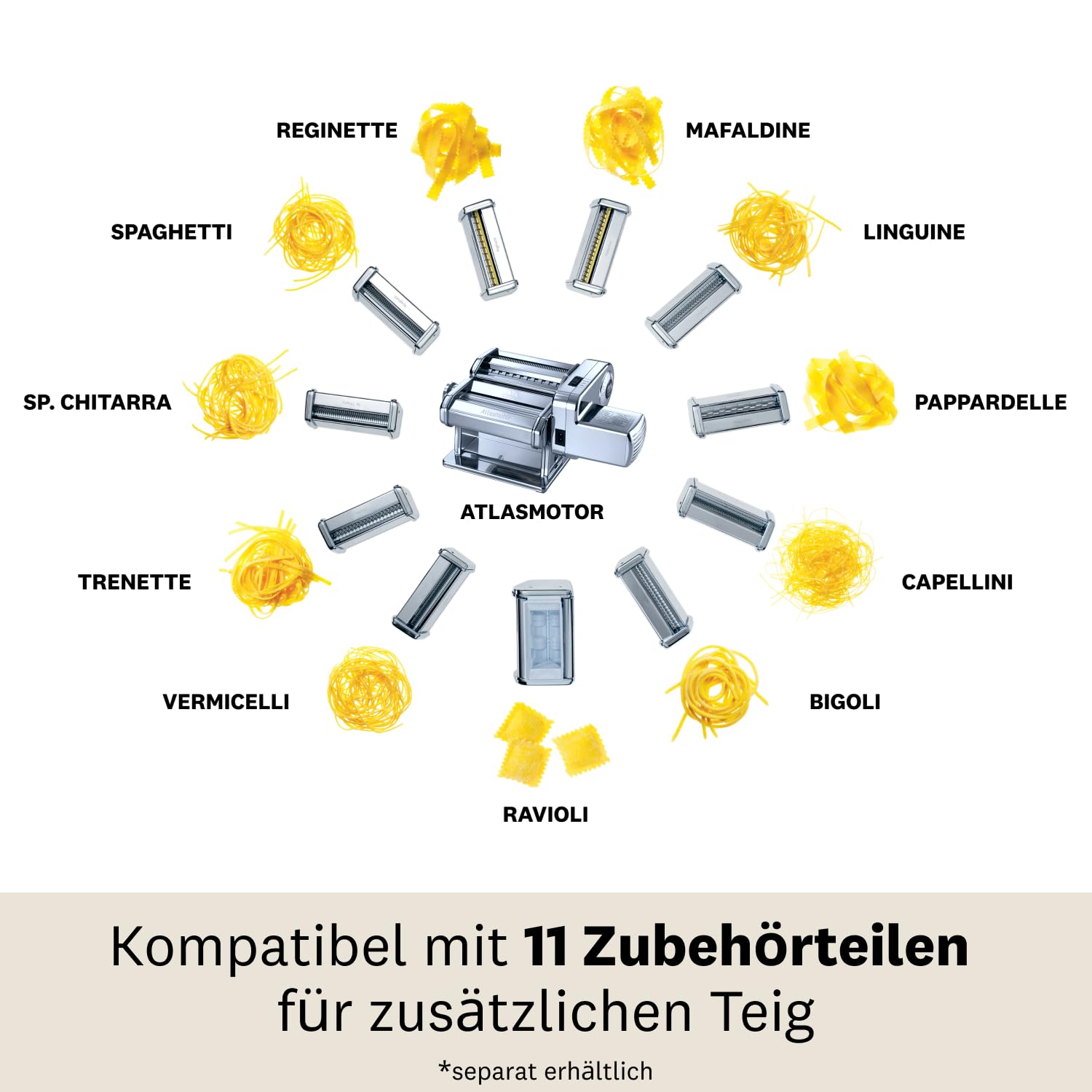 Nudelmaschinen ATLAS 150, MULTIPAST, ATLASMOTOR + hergestellt in Italien + robust und langlebig + leichte Handhabung Nudelmaschine ATLASMOTOR Material: Verchromter Edelstahl rostfrei. geeignet für Lasagne, Fettuccine und Tagliolini. Technische Daten: Betriebsspannung: 230V ~ 50Hz, Motorleistung: 100 Watt, Gehäuse aus Kunststoff Maße: 32 x 20 x 15,5 cm Artikel-Nr. 801551200